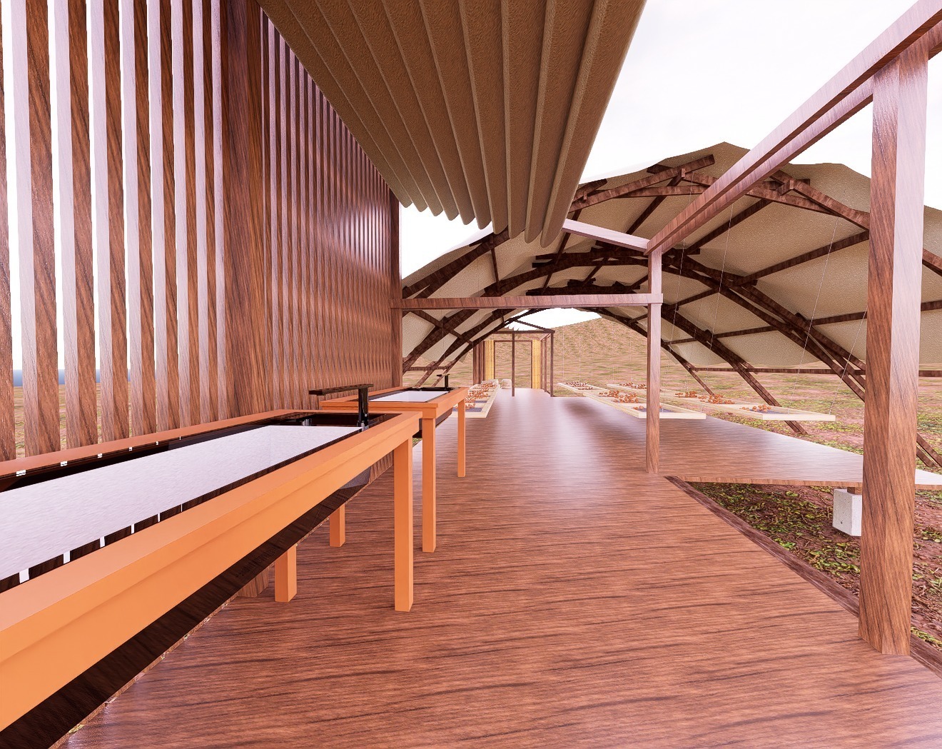 La propuesta esta basada en los fundamentos de una arquitectura esfimera en madera. con bases de pilotines, y madera de la zona, principalmente de Alamo, cuenta con dos modulos a sus extremos, con la posibilidad de poder duplicarlos si fuera necesario, el cual uno es un sector de lavado de la nuez, y el otro el del embolsado. En el centro esta la "nave central" del proyecto, que cuenta con una cubierta auroportante al estilo puente da Vinci, con la opcion de la colocacion en todo el modulo completo de una lona en su cubierta, retratil, por posibles lluvia. cabe aclarar que el clima en ese lugar, es mas bien seco, por lo cual pasan muchos meses sin llover, por eso la idea es una cubierta movil y no fija. A su vez, la idea es que una vez finalizado el proceso de la nuez, que dura aproximadamente 3 meses, esta madera sea reutilizada por la escuelita del pueblo, para armar escenarios o tarimas, para los actos escolares. Motivo por el cual, se reutilizaria el material.