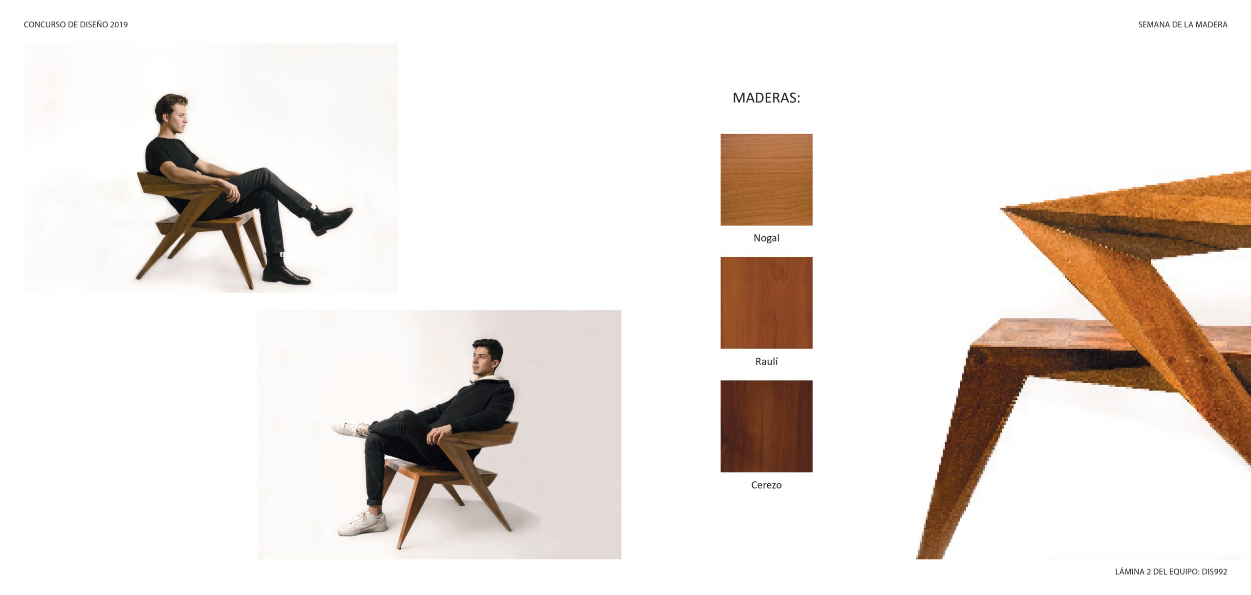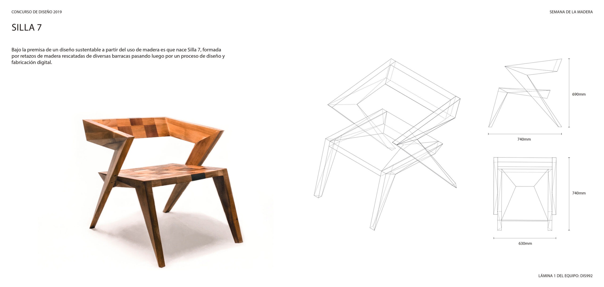 Silla 7 Frente a un futuro cada vez más cercano donde en la fabricación digital, tecnologías como la inteligencia artificial vendrán a sumar tanto a las máquinas como al proceso de diseño, y no sólo al de la propia fabricación instrumental. El proyecto de la silla 7 significa un punto de transición que relaciona procesos tecnológicos con el trabajo artesanal. El diseño de la silla alude a una estética retrofuturista propia de una época que miraba los avances tecnológicos como la carrera espacial y la era atómica con optimismo. La estética googie se caracterizaba por ángulos agudos y formas que aludían a alas y alerones de aviones y naves espaciales, obras de ingeniería símbolos de un futuro brillante. Bajo la premisa de un diseño sustentable a partir del uso de madera es que nace Silla 7, formada por retazos de métodos industriales rescatados de barracas pasando luego por un proceso de diseño y fabricación digital en una propuesta estética retrofuturista.