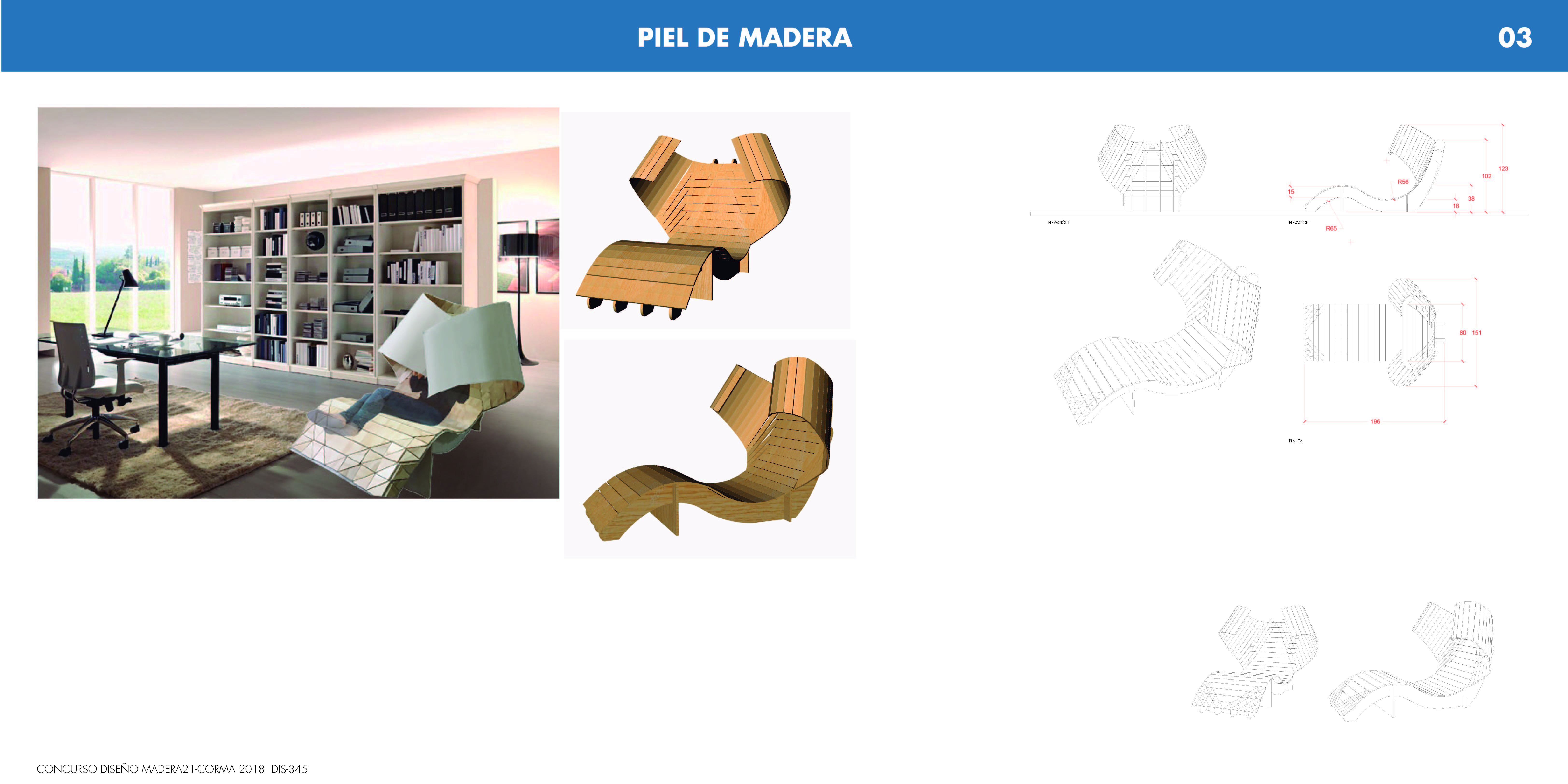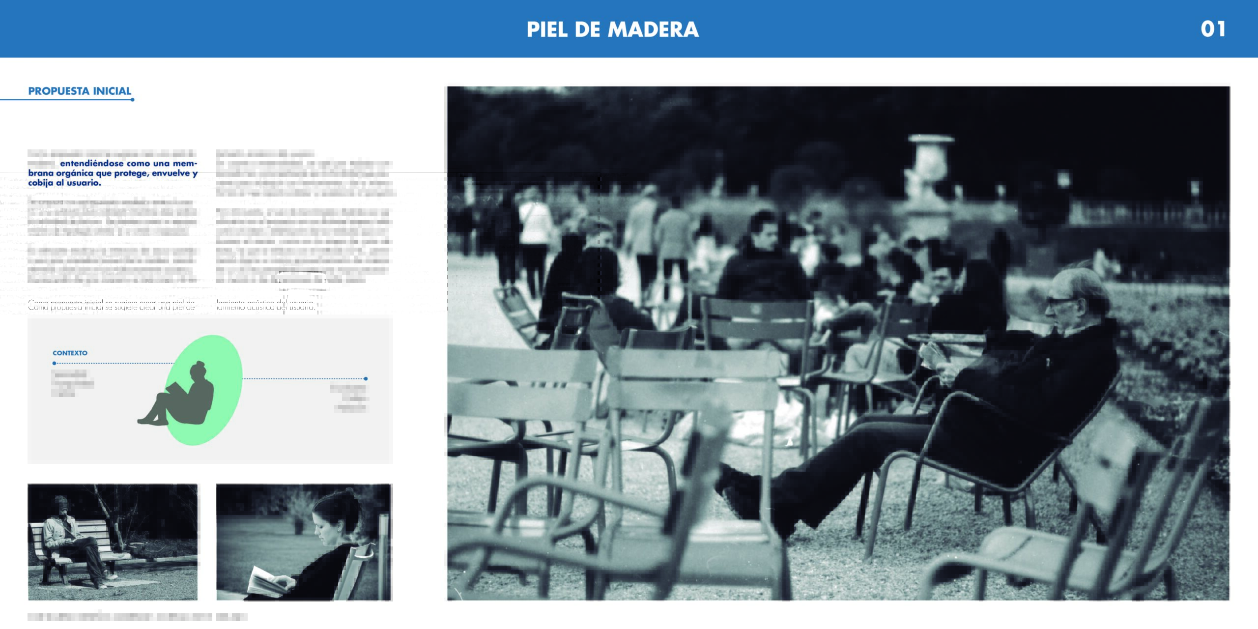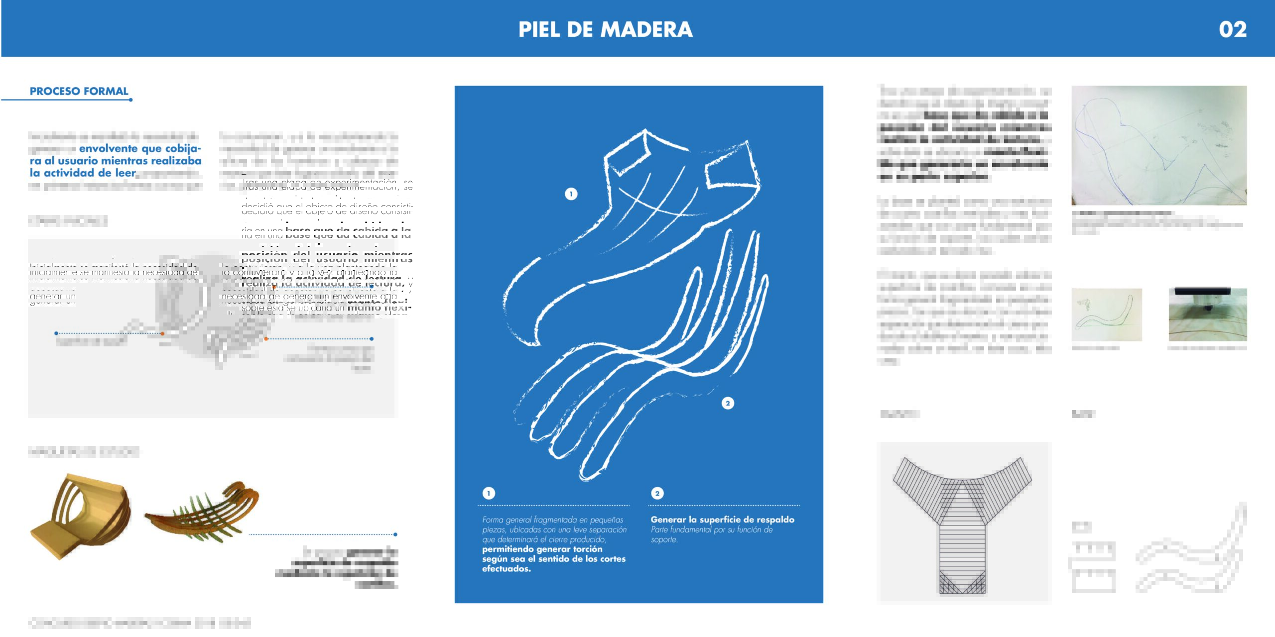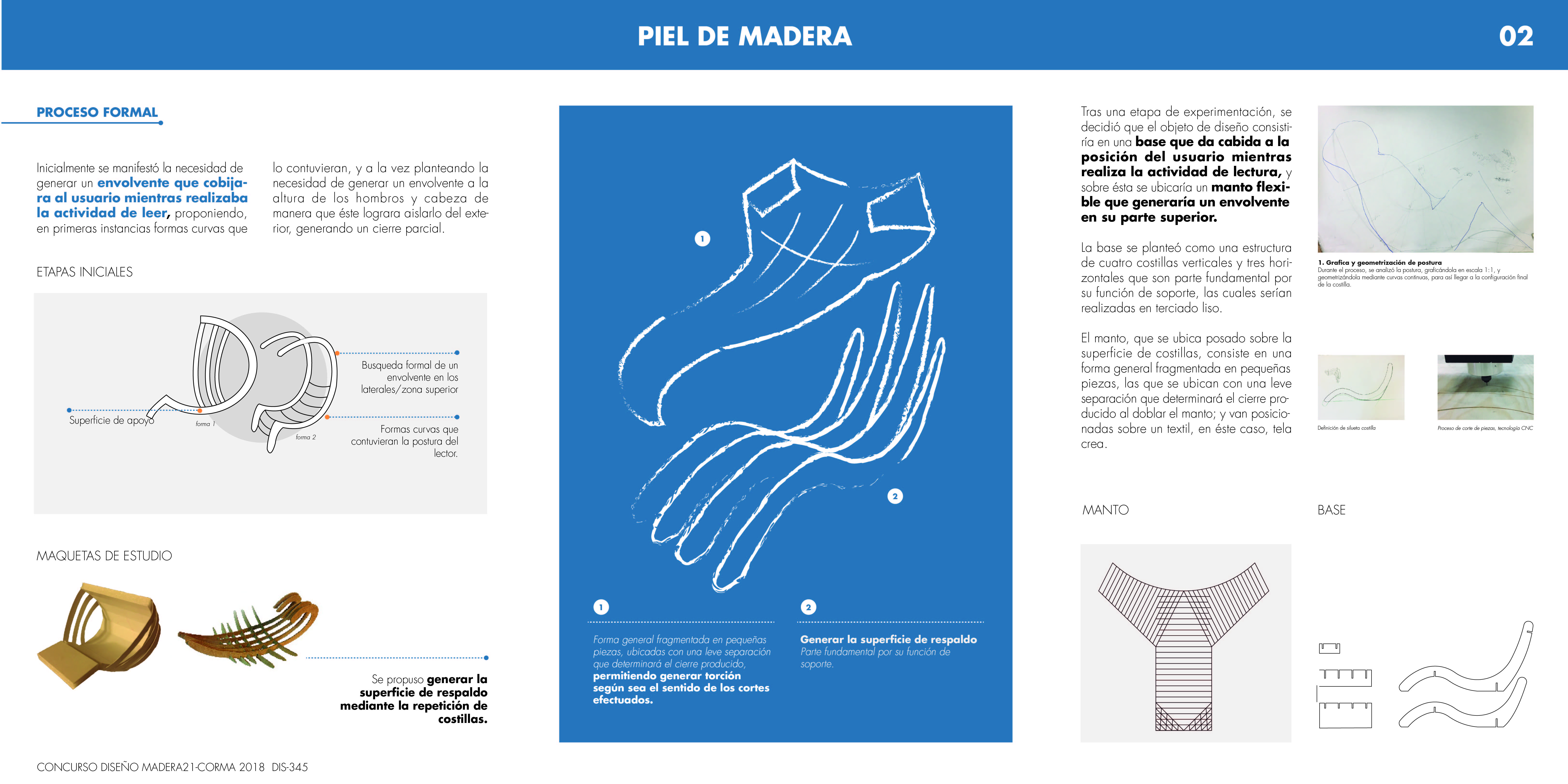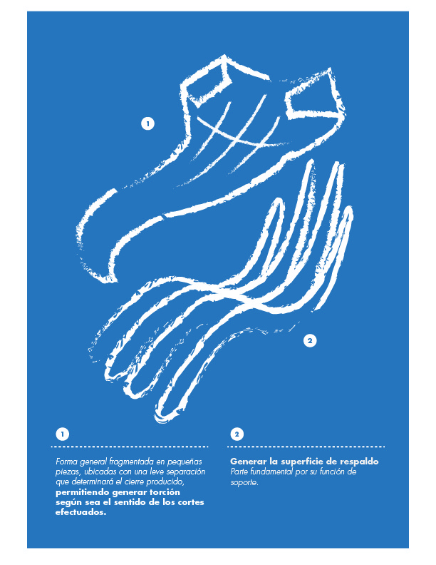 Se propone un equipamiento mediador entre el usuario y su entorno para cobijarlo mientras éste realiza la actividad de lectura. Se plantea como un equipamiento de tipología similar a un sitial o reposera. Éste se compone por una base de costillas, y sobre ésta un manto flexible conformado por pequeñas piezas que permiten generar torción según sea el sentido del corte realizado.