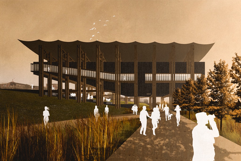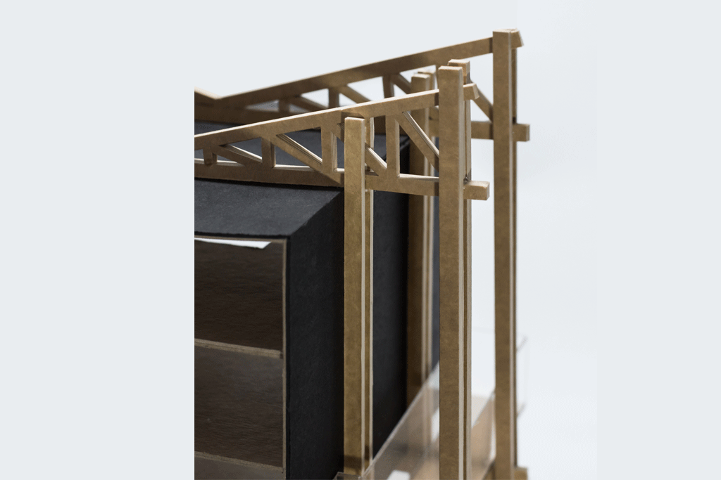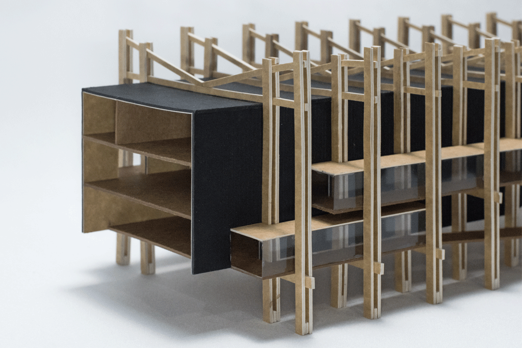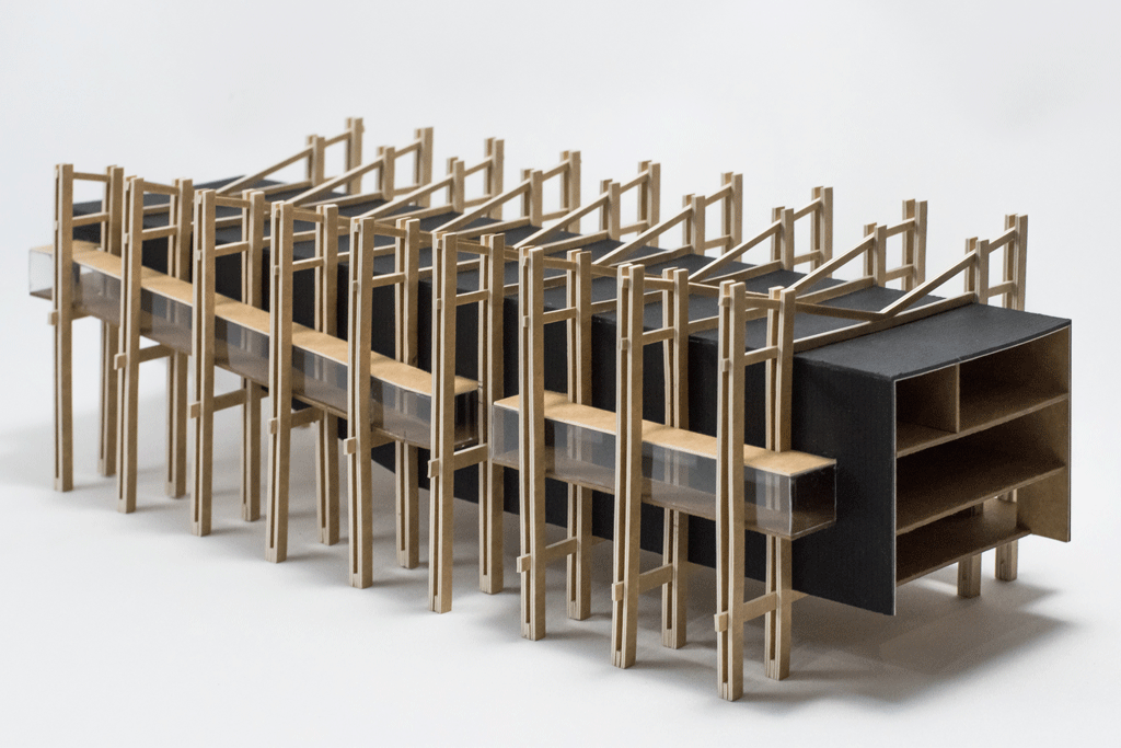 El edificio se conforma de un volumen central compuesto por muros y losas de CLT que funcionan en conjunto como una gran carcasa que contiene los recintos y programas del edificio, este cuerpo interior esta recubierto de madera carbonizada dando al edificio un carácter enigmático, ocultando su interior. Este núcleo se mantiene suspendido y trabado a través de un exo-esqueleto, que consta de una serie de 9 marcos constituidos por pilares y vigas compuestas, todos de madera laminada. Las vigas que soportan el cuerpo central también mantienen atada la cubierta tensil que remata al edificio, y evita el contacto directo de la madera con la intemperie y el clima. La exo-estructura permite liberar el nivel de suelo, para crear una plaza que aprovecha la pendiente y se aterraza hacia un anfiteatro público. Las circulaciones exteriores, anexas al cuerpo central, conectan los distintos recintos internos del edificio además de conectar también con el exterior, lo que permite simplificar la distribución interior de la obra.