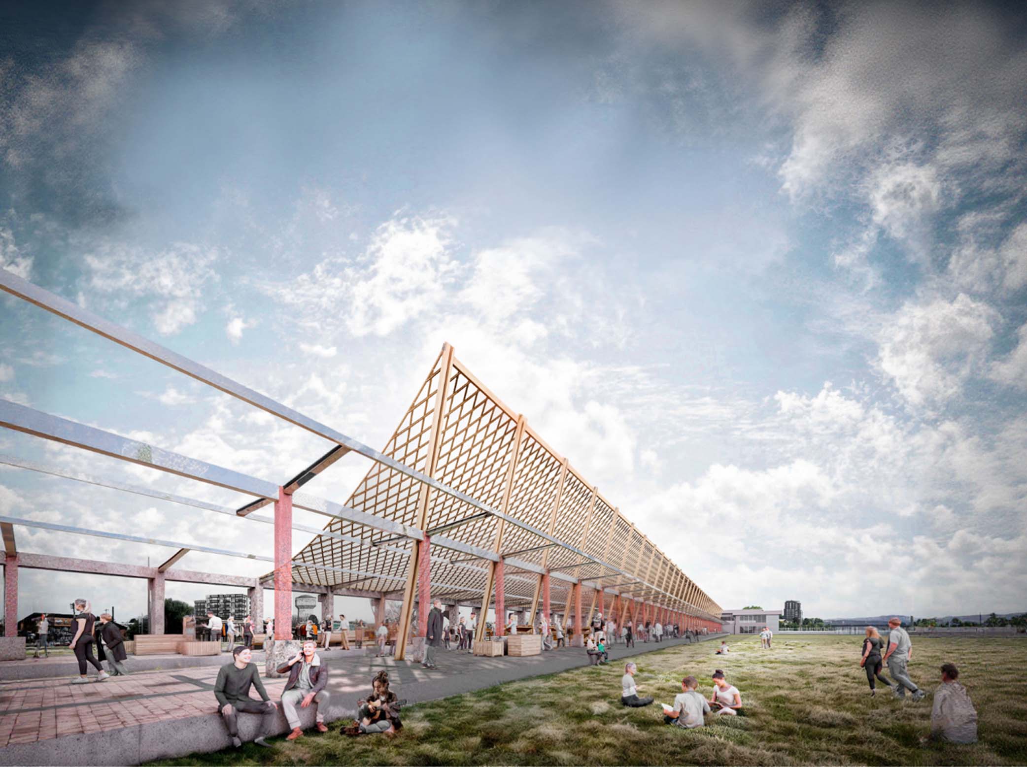 La intervención se emplaza directamente sobre los andenes existentes, reutilizando los pilares de hormigón originales como soporte estructural en uno de sus extremos, mientras que el otro se complementa con pilares de madera. Esta disposición evita alterar el sitio, respetando su configuración patrimonial. La cubierta proyectada, de 15 metros de ancho y 150 metros de largo, genera un espacio sombreado versátil que permite desarrollar actividades como ferias, talleres, conciertos y encuentros comunitarios. La resolución programática considera un uso estacional y flexible, promoviendo la participación ciudadana y el uso activo del espacio durante el verano. Así, se plantea una solución sensible al contexto, con énfasis en el uso colectivo y el rescate urbano.