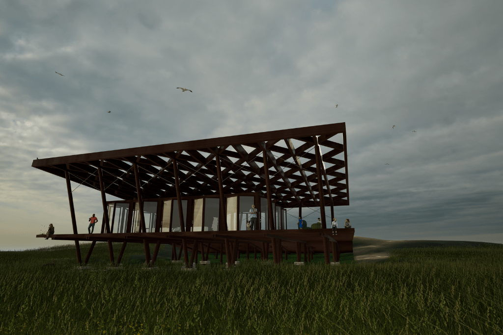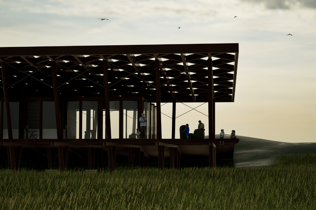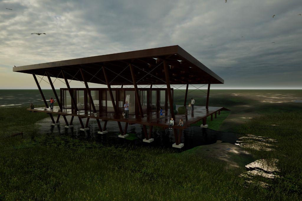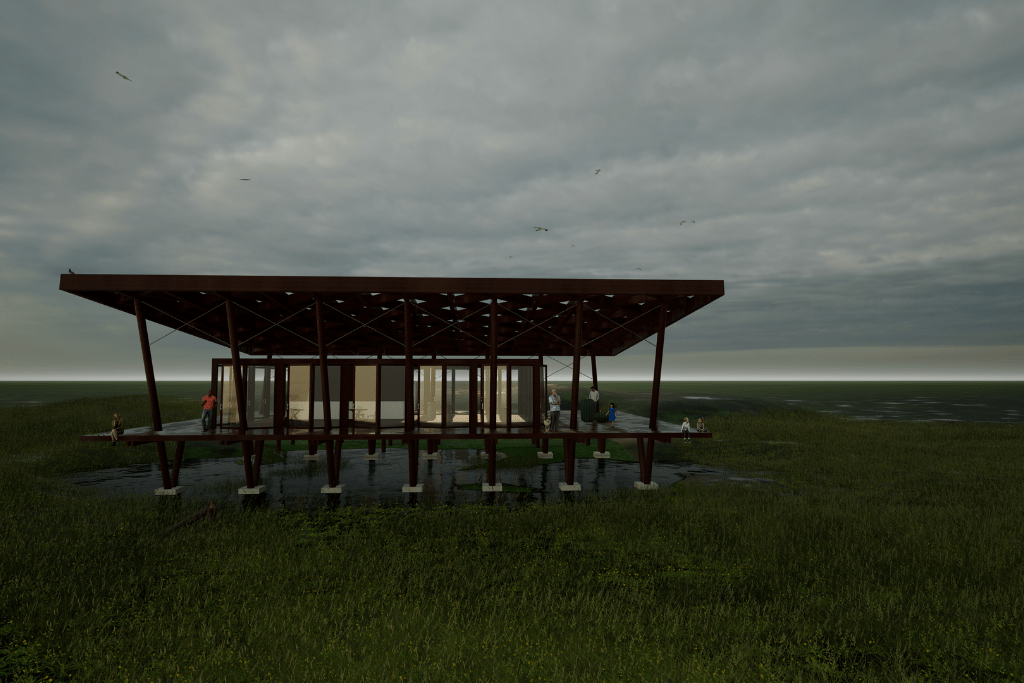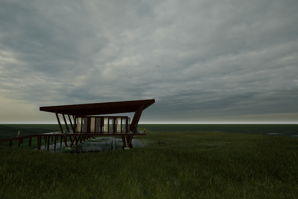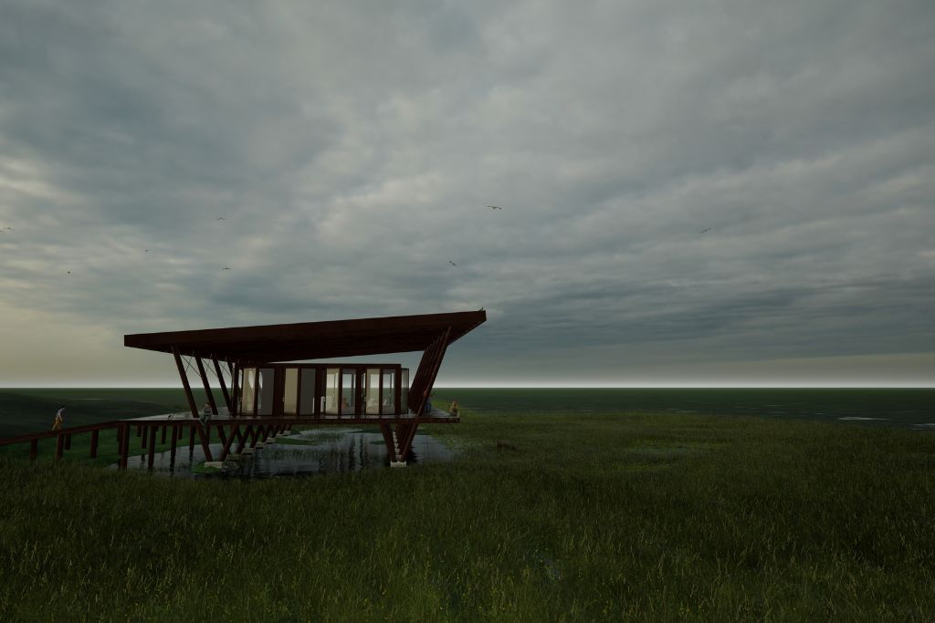 La estructura propuesta presenta un enfoque completo hacia edificaciones desmontables y adaptables que minimizan su impacto ambiental y que fue creada para proteger un ecosistema sensible de humedal. La estructura modular de madera permite construir una estructura exacta y portable que se puede desmontar sin causar daños permanentes al sitio. Los tensores metálicos junto con las columnas en “V” caladas brindan eficiencia estructural y diseño estético mientras que la cubierta inclinada grande funciona como un dispositivo que integra luz con sombra y aire y protección. La disposición abierta de la planta junto con un perímetro de vidrio permiten adaptarse a diferentes usos y proporcionan una conexión completa con el entorno natural circundante. El diseño presenta una nueva forma de conectar arquitectura con paisaje al funcionar como una presencia que es tanto sensible como activa y temporal y que protege la naturaleza y la cultura y el encuentro social en equilibrio.