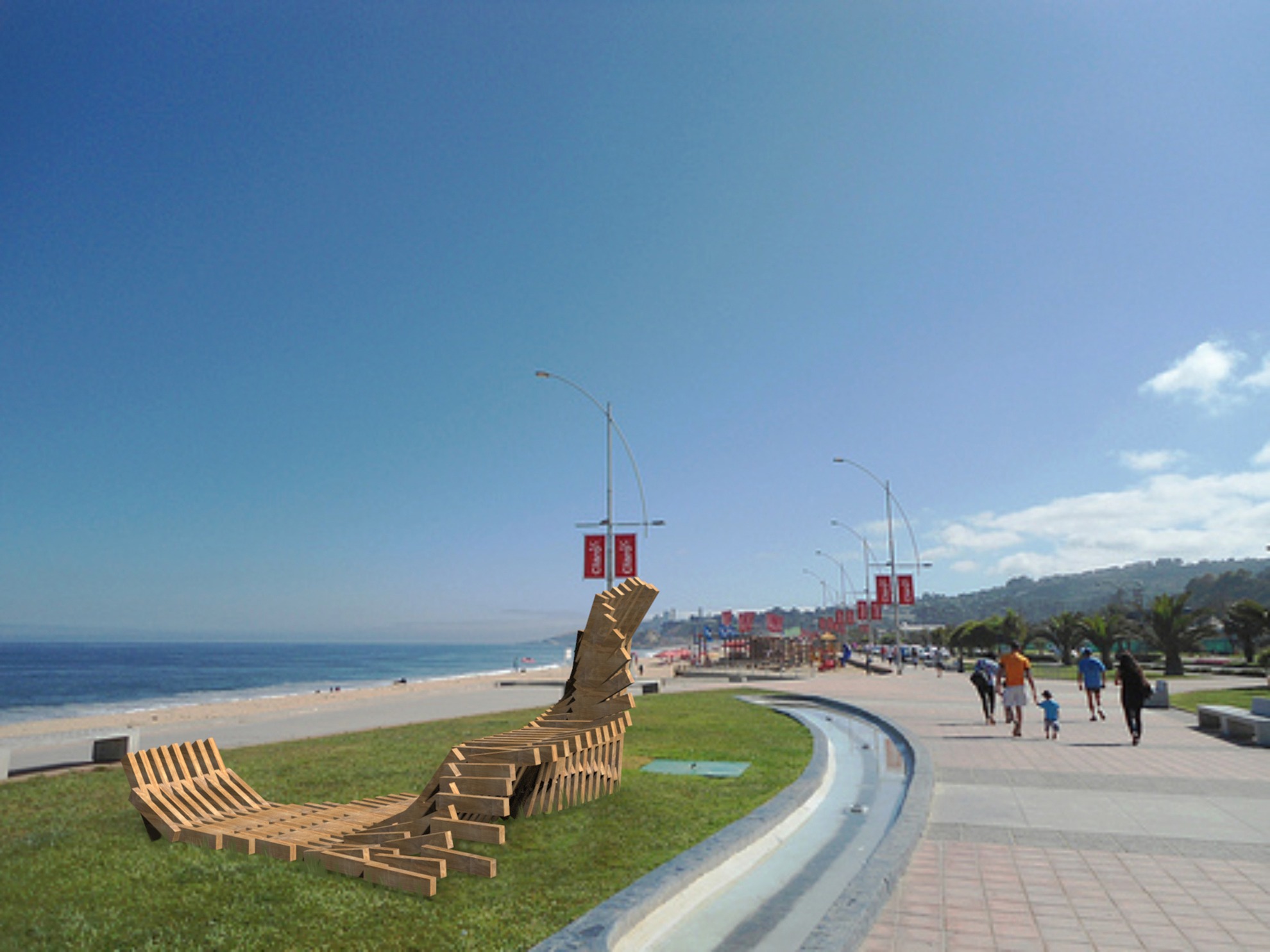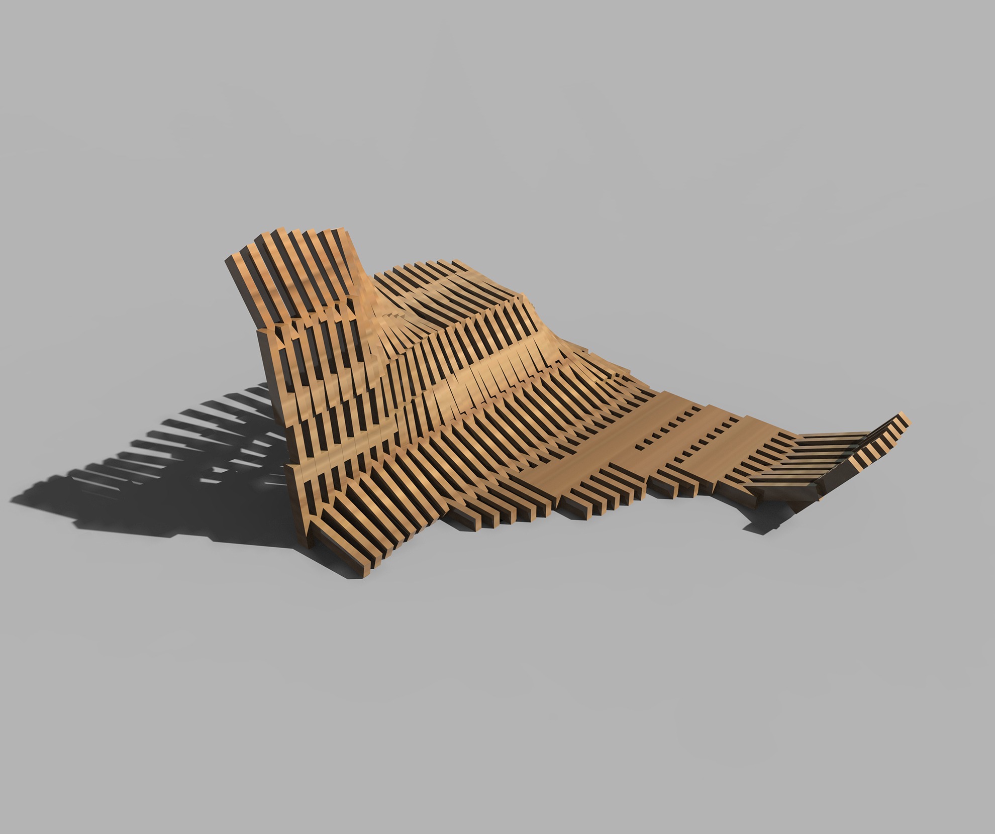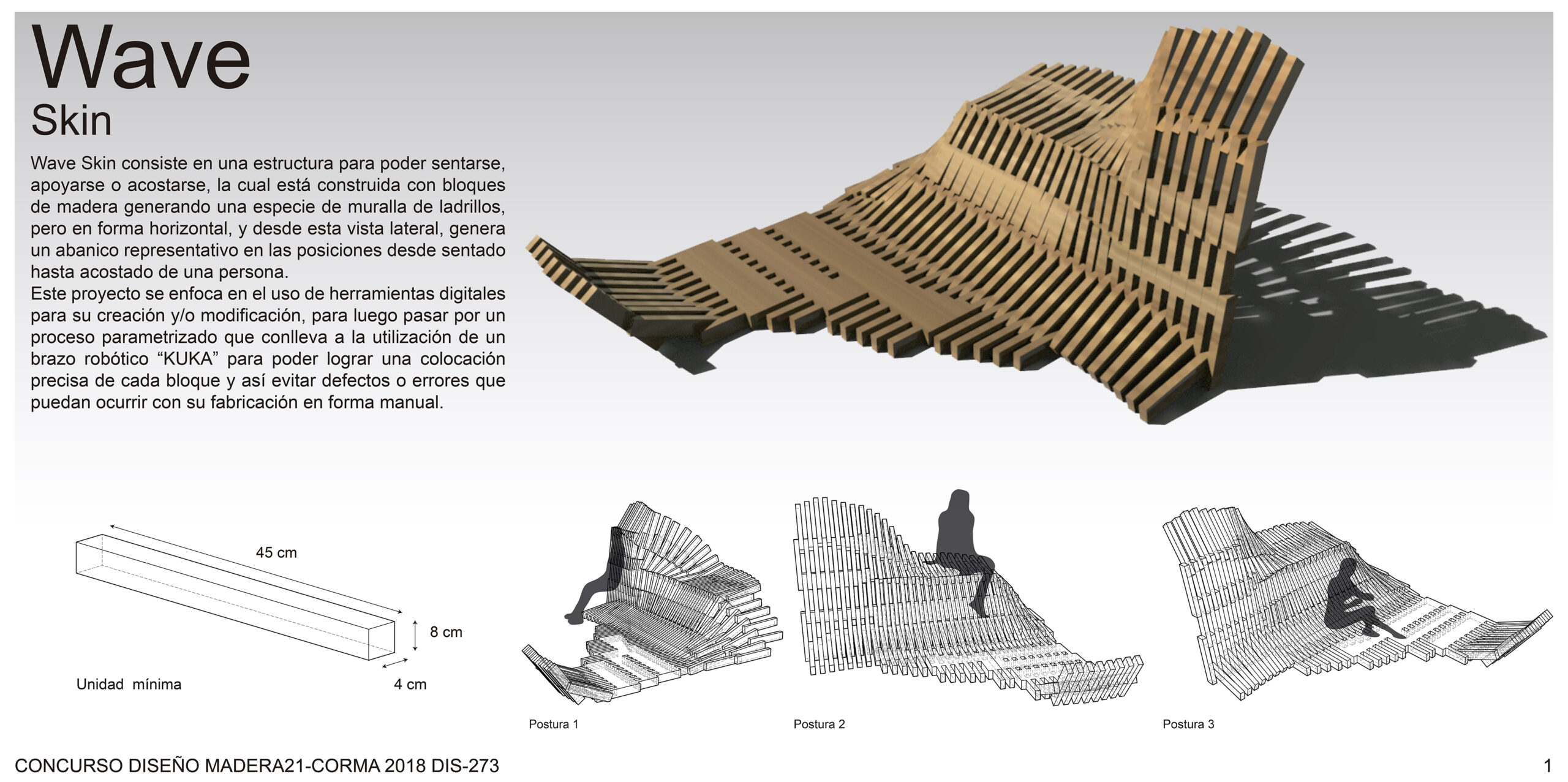 Wave Skin consiste en una estructura para poder sentarse, apoyarse o acostarse, la cual está construida con bloques de madera generando una especie de muralla de ladrillos, pero en forma horizontal, y desde esta vista lateral, genera un abanico representativo en las posiciones desde sentado hasta acostado de una persona. Este proyecto se enfoca en el uso de herramientas digitales para su creación y/o modificación, para luego pasar por un proceso parametrizado que conlleva a la utilización de un brazo robótico “KUKA” para poder lograr una colocación precisa de cada bloque y así evitar defectos o errores que puedan ocurrir con su fabricación en forma manual.