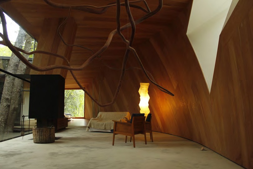 La Casa para el Poema del Ángulo Recto propone una arquitectura introspectiva donde la madera domina el interior de la vivienda, generando una atmósfera cálida y protectora frente al entorno natural. El proyecto toma su nombre del célebre poema visual de Le Corbusier y traduce esa referencia en una experiencia espacial marcada por la materialidad y la luz