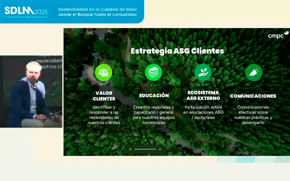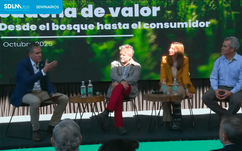 La conversación se abrió con una breve ponencia de cada integrante, a partir de la pregunta planteada por el moderador: ¿qué se entiende por sostenibilidad en la cadena de valor de la madera? Para el representante de la CMPC, el punto de partida está en reconocer la complejidad del recorrido de un producto y la responsabilidad asociada a cada etapa. “Tenemos que entender qué ocurre dentro del ciclo de vida de los productos y ser capaces de traspasar ese valor al cliente, más allá de los atributos técnicos”, explicó, subrayando la importancia de la trazabilidad, los datos y la colaboración.
