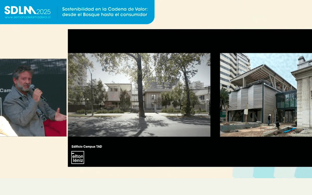 Léniz destacó el rol de la madera como material con múltiples atributos —térmicos, acústicos, constructivos— y puso énfasis en la industrialización como una oportunidad para reducir impactos, tiempos y costos. “Hoy no se trata solo de construir, sino de ensamblar. Eso cambia completamente la relación con el entorno, con los vecinos y con el territorio”, explicó, mencionando ejemplos de proyectos en vivienda, educación y equipamiento urbano.