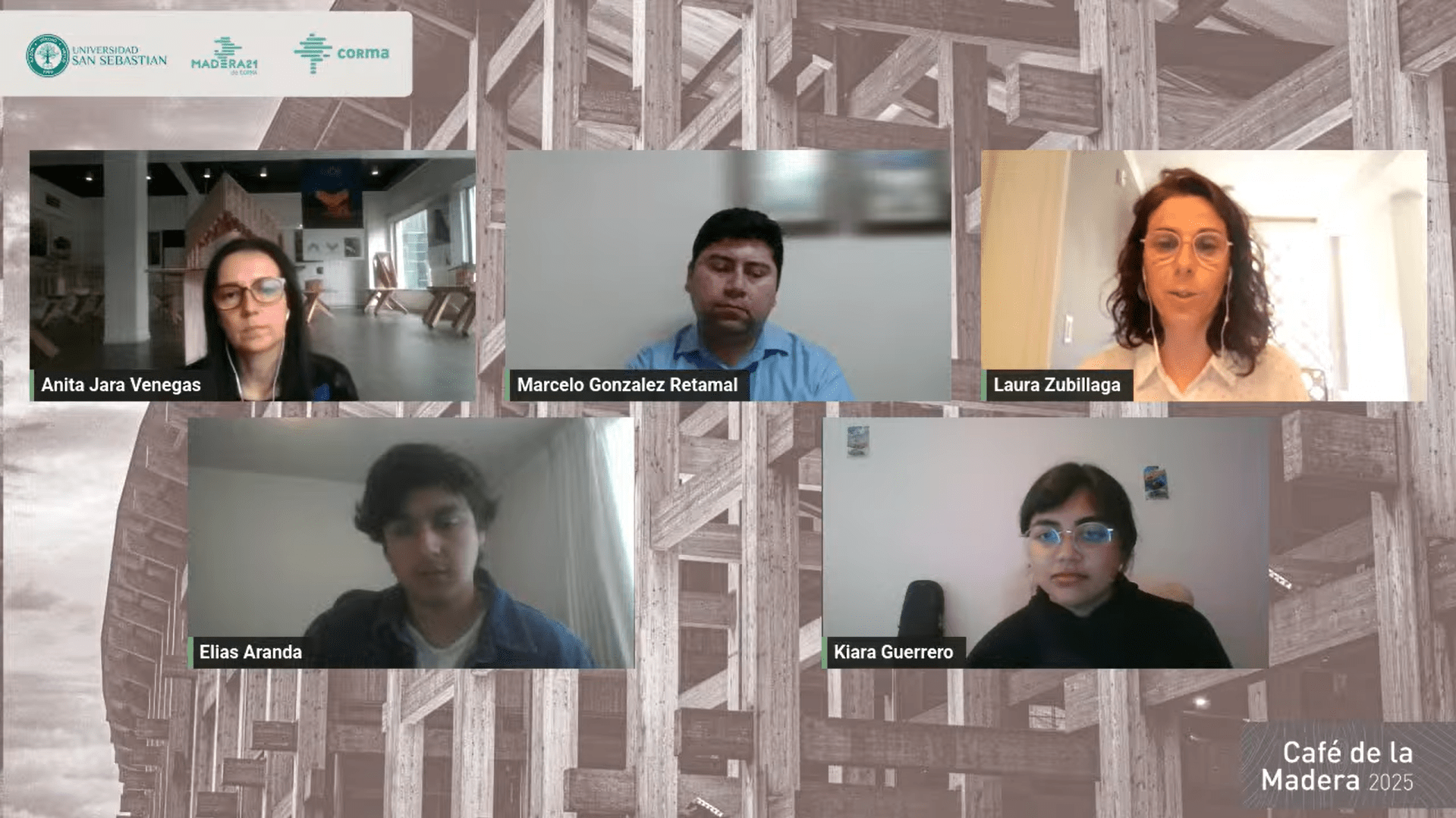 Panel de conversación: Laura Zubillaga – Wood Program, Universidad Aalto; Anita Jara y Marcelo González – Escuela Arquitectura, Universidad San Sebastián, Concepción, Kiara Guerrero y Elías Aranda, Estudiantes de arquitectura USS, Concepción,