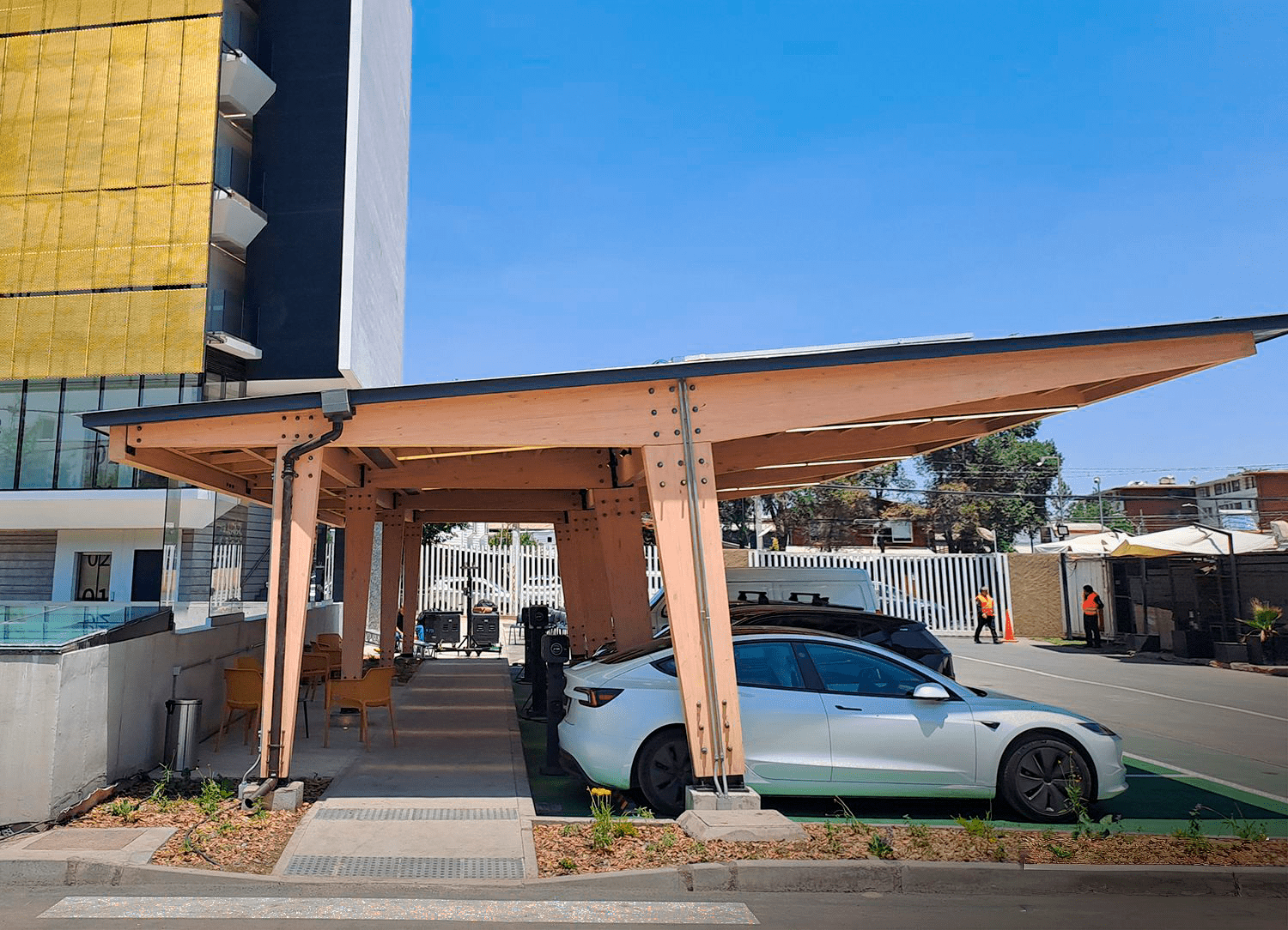 La infraestructura, construida con madera laminada y alimentada por energía solar, integra movilidad eléctrica, arquitectura sustentable y generación renovable en un mismo espacio, abriendo nuevas posibilidades para el desarrollo de soluciones de bajo impacto ambiental.