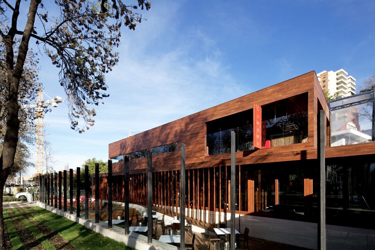 La madera adquiere protagonismo explícito en obras como el Restaurante Cumarú, ubicado en Nueva Costanera, donde el uso integral de madera Cumarú— madera tropical sudamericana extremadamente densa y dura- para pisos, muros, cielos, escaleras y celosías, definió tanto la atmósfera como la experiencia espacial. El proyecto surge, según relató el arquitecto, a partir del hallazgo y reaprovechamiento de una madera existente, transformando una decisión técnica en una identidad arquitectónica clara, basada en la continuidad material y en la calidez del espacio interior.
