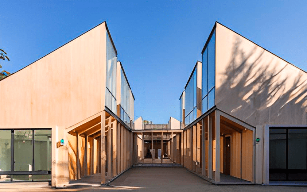 Uno de los proyectos centrales de la charla fue el Jardín Infantil Bambú, emplazado en la comuna de Las Condes en Santiago. Aquí, la madera estructura una propuesta que aborda simultáneamente la escala urbana, la acústica, la seguridad y la experiencia de los niños y niñas. El edificio, organizado en torno a un claustro, se entierra parcialmente para proteger a su entorno y generar un espacio interior contenido, donde las formas geométricas primarias —cubos, cilindros, triángulos— dialogan con el aprendizaje y el juego. Construido en pino insigne, con vigas y pilares laminados, el jardín integra luz natural, patios sucesivos y una materialidad que, en palabras del arquitecto, permite que los niños habiten un edificio reconocible, cercano y apropiable.